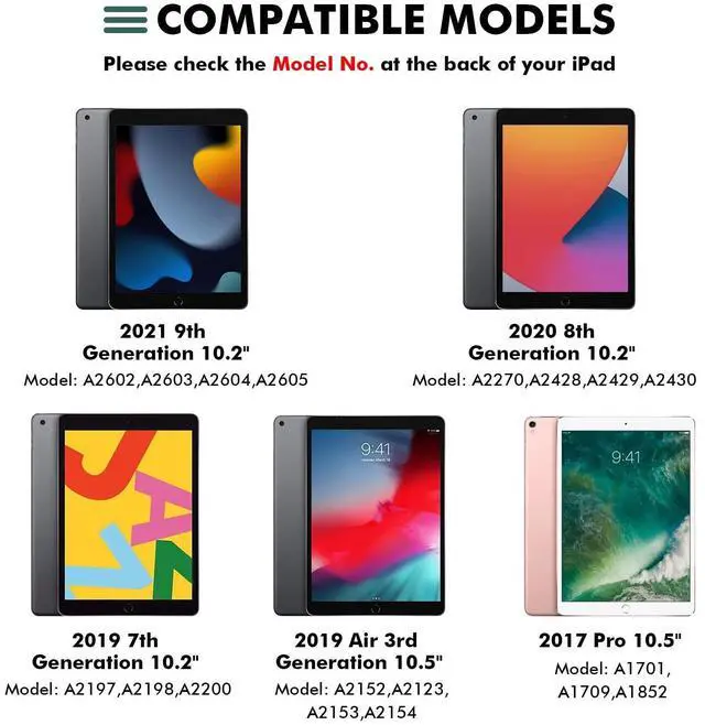 Compatibility: The case is designed for iPad 10.2 & 10.5 inch, which is compatible with the latest iPad 9th 2021 (A2603/A2604/A2605), 2020 iPad 8th genneration (A2270/A2428/A2429/A2430) / iPad 7th generation 10.2 inch 2019 (A2197/A2198/A2200), iPad Air 3 2019 (A2152/A2123/A2153), iPad Pro 10.5 inch 2017 (A1701/A1709). Not compatible with any other iPad models.
