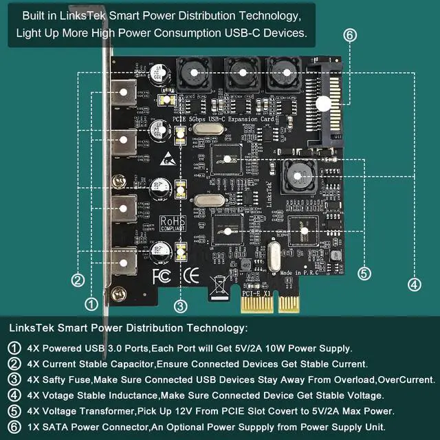 ^^ 3. Built in LinksTek Smart Power Distribution Technology, will pick up power supply from motherboard PCIE slot. Users do not need to plug extra power supply cables but get enough power, each USB-A ports will get 5V/2A 10W max for connected high power consumption USB device such as USB NVME SSD enclosure. ^^ 4.