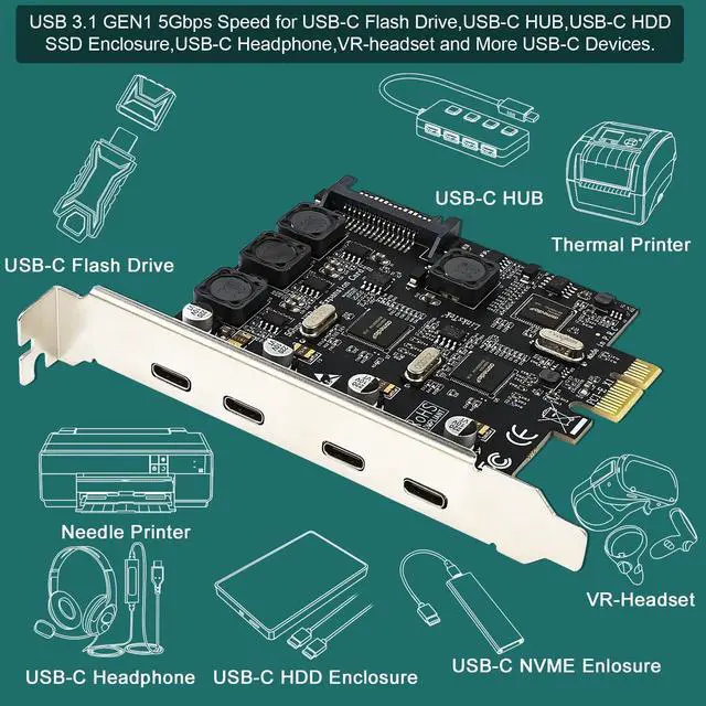 1. PCIE-U304C allow users add 4X USB 3.0 (USB 3.1 GEN1) Type C 5Gbps max ports on Desktop PCs and Working Stations for USB 3.0 (USB 3.1 GEN1) devices connection. Enjoy super easy installation, plug and play on most main stream Windows PCs. ^^ 2. Based on ASMedia ASM1042 PCIE USB 3.0 (USB 3.1 GEN1) host controller and ASM1074 USB 3.0 (USB 3.1 GEN1) HUB. Provide 5Gbps total bandwidth on 4X added-on USB-C ports for USB 3.0 (USB 3.1 GEN1) devices data transmission which include USB HDD/SSD enclosure, USB universal docking station, USB Hub, USB KVM switch, VR-System, USB graphic adapters and more USB devices.