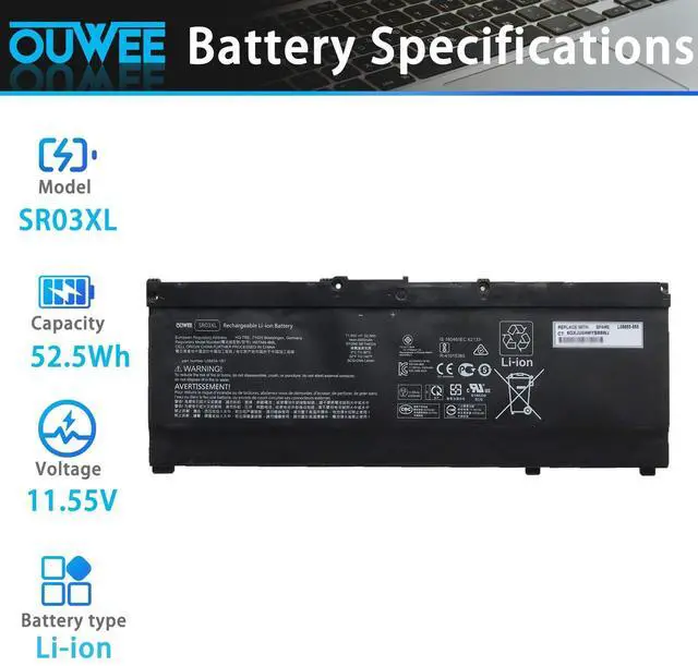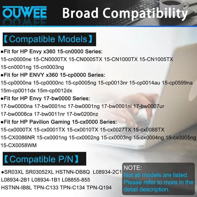 Capacity: 52.5W h 4550mAh. ^^ Compatible Part NumberSR03XL SR03052XL HSTNN-DB8Q L08934-2C1 L08934-2B1 L08934-1B1 L08855-855 HSTNN-IB8L TPN-C133 TPN-C134 TPN-Q194. ^^ Replacement For LaptopHP Envy x360 15-cn0000 15-cn0000ne 15-CN0000TX 15-CN0005TX, 15-cp0000 15-cp0005ng 15-cp0013nr 15-cp0014au 15-cp0599na 15-cx0020nr 15-CX0058TX 15m-cp0011dx 15m-cp0012dx, Pavilion Gaming 15-cx0000 15-cx0000TX 15-cx0001ng 15-CX0058WM Series Notebook. ^^ CertificateAll OUWEE products are Certified by CE, FCC for safety. Strict guidelines for compatibility, and standards compliance for environment safety. ^^ OUWEE Worry-Free Warranty ServiceRest assured with 30 days Refund and 12 months Replacement, also get our friendly customer service.
