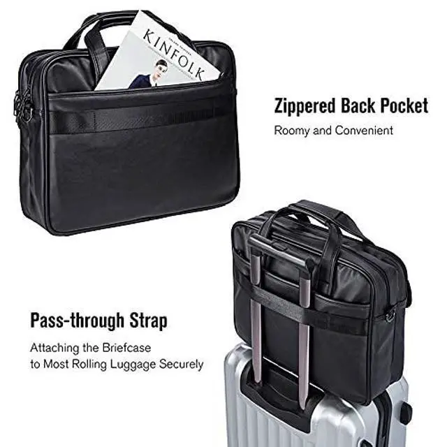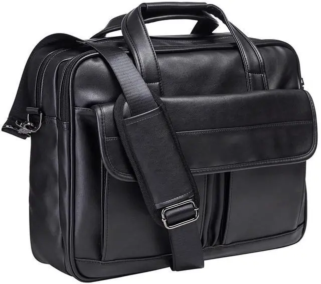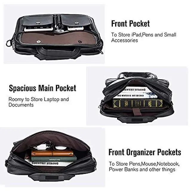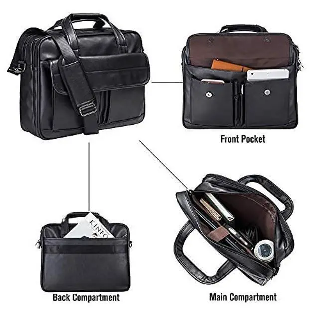 Features: LARGE CAPACITY - The men laptop briefcase includes external 2 pouches & 2 pen slots and inside several slots in front large pocket with adhesive hook and loop under flap over, storage penholders, documents, binder, power cords, mouse, 2 main zipper Pocket with foam padded sleeve fits most 17. 3 Inch laptop, back invisible zipper pocket for your valuables STURDY AND WATERPROOF - Made of high quality water-resistant PU leather fabric to provide maximum strength, durability, and longevity. Excellent keeping inside items dry against from splashing, even on rainy day DIMENSIONS - The size of this spacious satchel is 17.3" (L) x 13.3" (H) x 5.9" (W); which it is roomy for laptop, books, clothes.