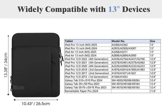 Fit for - Designed for 13 inch tablets and fits smart keyboard, compatible with iPad Air 13" (M3 2025/M2 2024), iPad Pro 13", iPad Pro 12.9", Galaxy Tab S9+/S9 Plus/S10+/S10 Plus/S9 FE+/S9 FE Plus 12.4", Remarkable Paper Pro 11.8" ^^ Waterproof & Durable Materials - This protective sleeve is made of premium materials with fine workmanship, the water-repellent exterior can protect against fluids and dust, and the padded foam interlayer and soft fleece interior lining are soft and safe for your device, keeping your device from being accidental bumps and scratched.