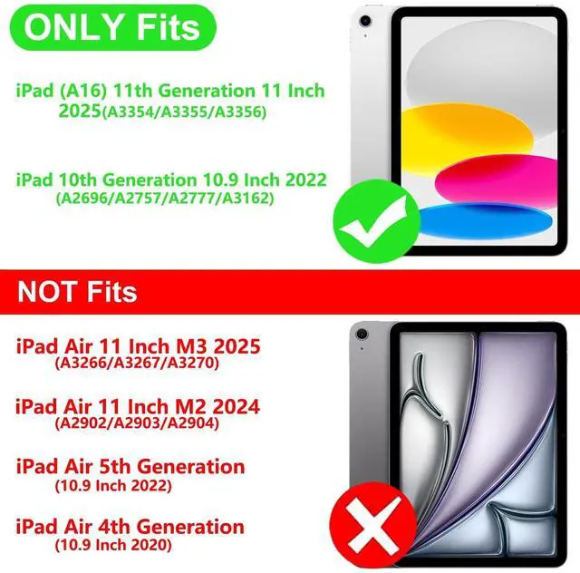 • Compatible Models: Designed for iPad A16 11 Inch 2025 And iPad 11th Generation 11 Inch 2025 And iPad 10th Generation 10.9 Inch 2022. Not Compatible With Other Tablet Models. Please Kindly Check The Model Number At The "Setting- "About DeviceOf The Tablet Before Purchase.