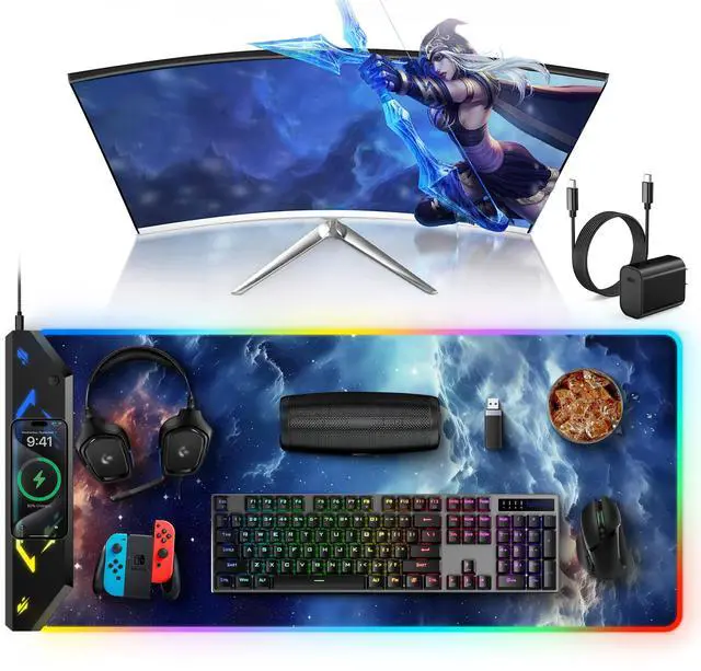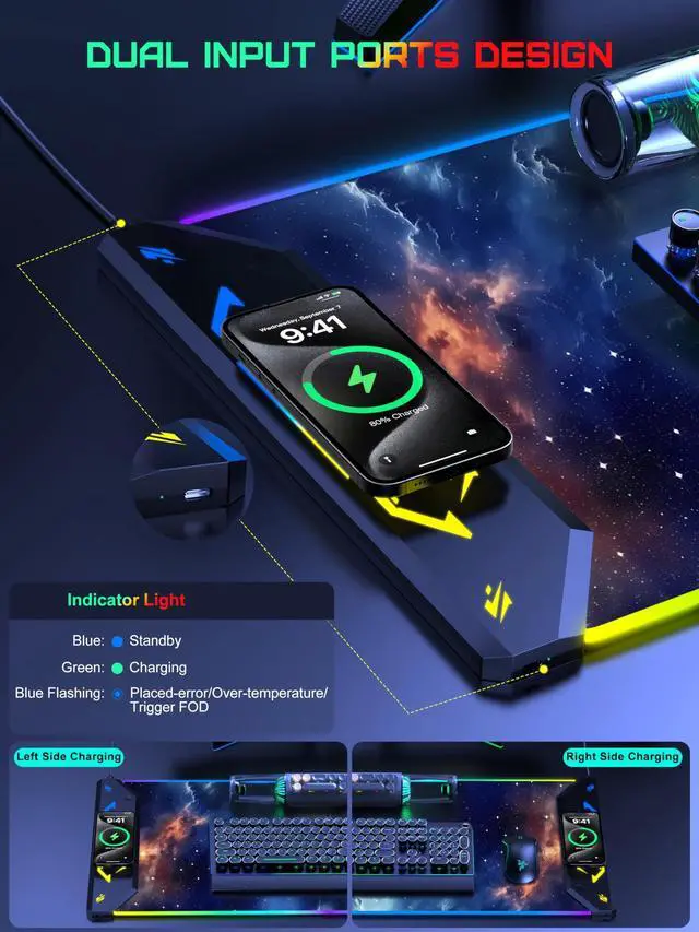 Extra Large XXXL 5-IN-1 Wireless Charging Mouse Pad for Desk TopMade newest extended mousepad is 35.4" x 15.8", the extra large usable area covers your desk keyboard, mouse, and other items while gaming or working, and combines 5 functions of phone charging, AirPods charging, cool RGB light, desktop protector and mouse pad in one, allowing you to charge your iPhone or AirPods while using the gaming mousepad without the need for additional cables interfering with your desk, keeping your desk neat and tidy ^^ Newly Upgraded Dual Input Ports Design This wireless charging desk mat is designed with dual input ports, simply connect the power adapter and charging pad to either input port with the data cable to realize wireless charging, no matter if you are left-handed or right-handed, you can flexibly place the charging pad on the side you need it according to your own usage habits.