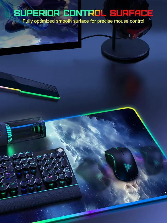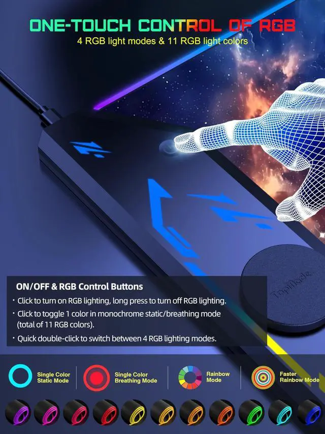 Please Note that both ports are input ports and cannot be used as output ports for power supply ^^ Max 15W Fast Qi Wireless Charging The round raised magnetic charging area has built-in powerful magnets that makes it easy to align the wireless charging position to charge your device, designed for iPhone 17/16/15/14/13/12, AirPods Pro 2nd/Pro/4rd/3rd/2rd (magnetic wireless charging case version only). It also provides up to 15W fast charging for Samsung Galaxy S23/S22/S21/S20/S10/S9/S8/Note 9/8 and other Qi wireless charging-enabled devices. Not compatible with any Apple Watch model ^^ One-Touch Control for 4 Light Modes & 11 RGB Colors This RGB gaming mouse pad has 11 lighting colors and 4 cool lighting modes: Single Color Static, Single Color Breathing, Rainbow, and Faster Rainbow Mode. Long press the RGB light mode option key to control the light on/off (one click also turns on the RGB light); click the option button to toggle between the 11 light colors; and a quick double-click on the option button to toggle between the 4 light modes ^^ Ultra-Smooth Surface This gaming mouse pad is designed with a smooth textile weave to ensure that you have precise control of your mouse with a smooth glide; the comfortable and smooth surface also can also be used as a mouse pad, desk mat, desk blotters and writing pad ^^ Non-Slip Rubber Base The soft and dense non-slip rubber base can keep this desk mat provides excellent grip and keeps the mousepad firmly in place on your desktop, so you can simply immerse yourself in your work or game without worrying about the annoying mouse pad moving around ^^ Durable & Easy to Clean Protects your desktop from scratches, stains, spills, heat and scuffs. The waterproof surface is easy to clean, just wipe with a wet cloth or paper; stitching around the edges of the table pad ensures a more durable and long-lasting pad that won't fray or peel ^^ What You Get Wireless Charging Mouse Pad x 1, 20W USB-C Fast Charger Block x 1, 6.56 ft USB-C to USB-C Woven Cable x 1, User Manual x 1, 24 hour friendly customer service and 12 months of full technical support
