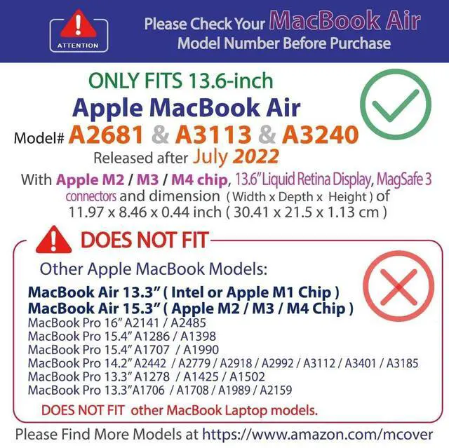 NOTE: Before placing order, PLEASE make sure to verify your laptop model number as this case is MODEL specific and NOT interchangeable. ^^ NOT fitting other Apple MacBook laptop computers. NOT compatible with ANY other laptops as well. ^^ Made of high-quality translucent polycarbonate material which is shatter-proof and will protect your 2022 or later 13.6 MacBook Air Laptop Computer (Model A2681, with M2 Chip, 13.6" Liquid Retina Display, USB-C + MagSafe3 connectors ) all around ^^ Designed to perfectly fit the 2022 or later 13.6 MacBook Air Laptop Computer (Model A2681, with M2 Chip, 13.6" Liquid Retina Display, USB-C + MagSafe3 connectors ) ^^ 2-piece light-weight ( 9.3 oz or 264 g ) shell easily snaps on and off.