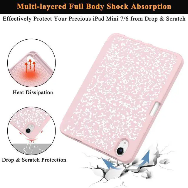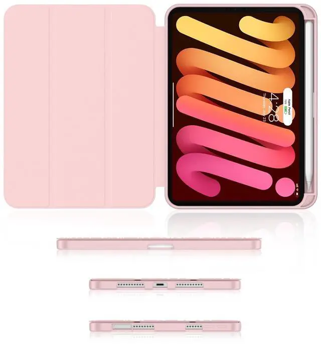 Built-in pencil holder: Support the 2nd Gen Apple Pencil's magnetic attachment and support wireless charging on the slot, keep the Apple Pencil as safe as your iPad Mini7 Mini6 all the time. (Pencil is Not included). Ultra Slim & LightweightMinimal Bulk & Minimalism Style. Great for carrying your iPad Mini 7th/6th gen around. Auto Wake/SleepProvide the auto sleep/wake function with a built-in magnetic strip. Premium MaterialPU leather case with TPU edge offers strong protection. Accurate DesignThe Snug-fitting case allows easy access to all ports, volume, power button, camera, and headphones. Viewing & Typing Stand ModeTri-fold magnetic cover easy to transform the case into a viewing and typing stand. Heat DissipationInner back honeycomb pattern design immensely enhances heat transfer