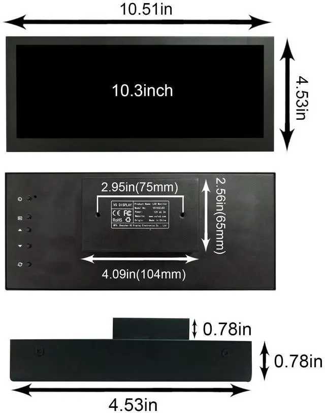 Temperature: -30 degree to 80 degreeWeight 980g/ 2.16LBP acking list: 1 10.3 inch 1920x720 VS103ZJ02-823 LCD Monitor1 Bracket1 12V 2A Power Adapter