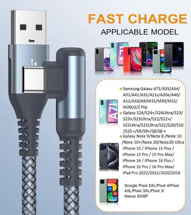 Perfect]: USB to USB C Cable has electronic safety certifications that comply with appropriate standards, it built-in laser welding technology, which ensure the metal part won't break. The longer SR anti-break design enhances the durability of the cable. With 40, 000+ times bend test, the flexible and durable double-braided nylon type C cable longer service life and will never rupture. ^^ [Universal Compatibility] Compatible with iPhone 17 16 15 Pro Max Plus iPhone Air, Samsung Galaxy S25 S24 S23 S22 S21 S20 S10 S10e S9 S8 Plus/FE/Ultra, Note 20 10 9 8, A73 A72 A71 A55 A54 A53 A52 A51 A50 A42 A33 A32 A23 A22 A21 A20 A15 A14 A13 A12 A11 A10e A03S A02S, Tablet S8 S7 S6, Kindle Fire HD 10 8th, Google Pixel, LG, Moto G, PS5 Controller & More USB-C devices. ^^ [WARRANTY&RETURN or REFUND is