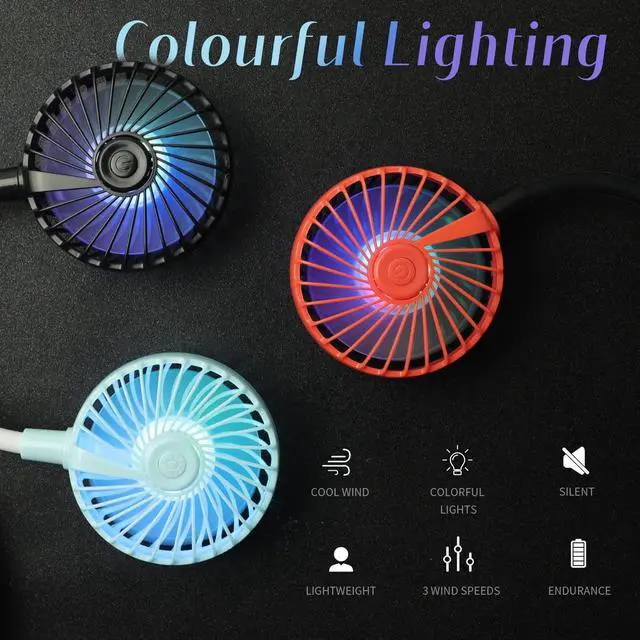 New Design for Easy OperationOur USB portable neck fan has a new design. For simple operation, we move the button to the middle of the fan, which makes it easy operation. The old version fan which has button beside the neck is difficult to use, because you cant see the button when you want to turn on/off the fan. ^^ Colorful LED LightingOur cooling neck fan also features fun and colorful LED lights that can be turned on or off to create a more atmospheric style that lets you glow in low light or dark settings.