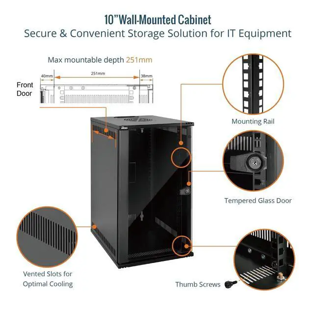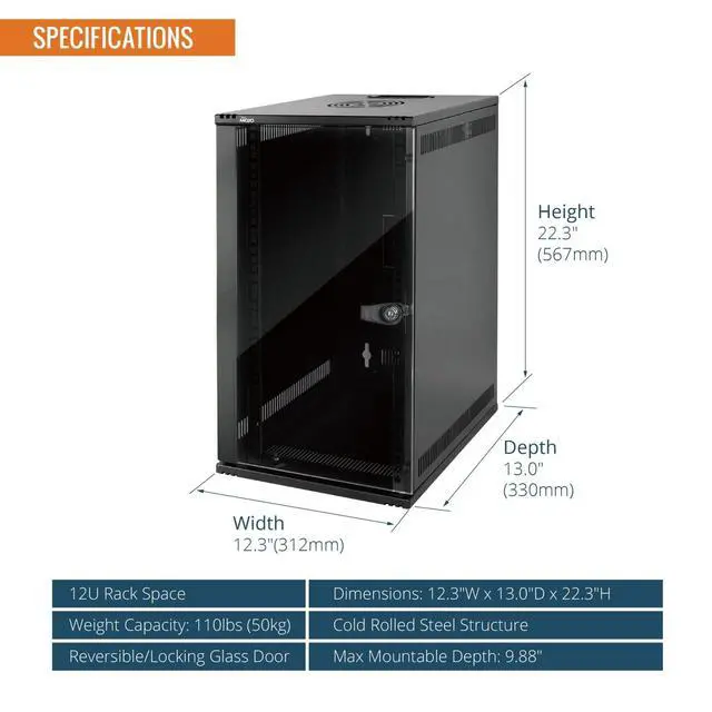 Wall Mount Design: Measures 12.3W x 13D x 22.3H with a reversible tempered glass locking door, 12u 10inch rack offering secure, organized storage in tight spaces. Max mountable depth 251MM ^^ Easy Assembly &