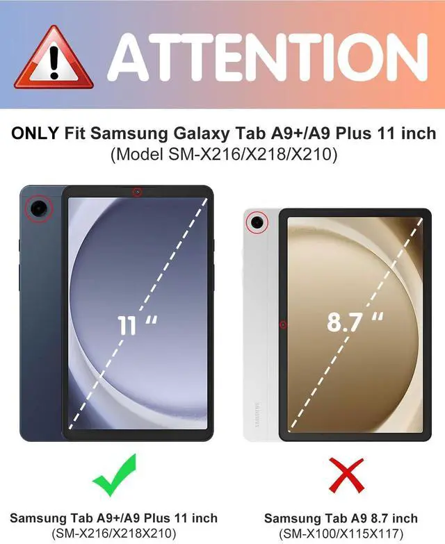 Compatible ModlesThis case compatible with Samsung Galaxy Tab A9 Plus Case. Please check your model before purchasing. ^^ Adjustable AnglesThis for Samsung Galaxy A9 Plus case, provides two supporting angles, creating a comfortable viewing and operating experience for you. ^^ Build-in Pencil HolderA build-in pencil holder was designed in this for Galaxy A9 Plus case. Making it easier to put in and take out your pencil, and also prevent accidental loss and damage. ^^ Auto Sleep/WakeThe function of auto wake/sleep is achieved by a magnet, which can extend standby time for Samsung Galaxy A9+ Case/ for Samsung A9 Plus 11 inch.