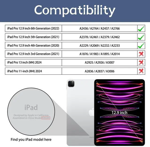 [Compatibility] - Lornpa Case for iPad Pro 12.9 2022 6th generation (model: A2437/A2764/A2766), iPad Pro 12.9 2021 5th generation (model: A2378/A2379/A2461/A2462), iPad Pro 12.9 2020 4th generation (model: A2229/A2069/A2232/A2233). It is Not compatible with any other devices. Please check back bottom of your iPad to find the model number. ^^ [Auto Wake/Sleep] - Built-in magnetic strip automatically wakes or sleeps the device when opening and closing the cover, protecting and prolonging battery life. ^^ [Superior Protection] - Made of synthetic PU leather and shockproof flexible soft silicone, Ultra slim and lightweight design adds minimal bulk while offers your device great protection, with cute flowers pattern print on it. Suitable for women, girls, ladies. ^^ [Multi-Angle Stand] - Magnetic tri-fold stand creates a stable viewing and typing mode for iPad. The precise cutout design gives you full access to all features (buttons, speakers, camera, charging port). ^^ [Pencil Holder] - Our Lornpa case not only protects your device but also features a dedicated Pencil holder. It makes sure your pencil is securely stored, and ready for note-taking, drawing, or navigating. (