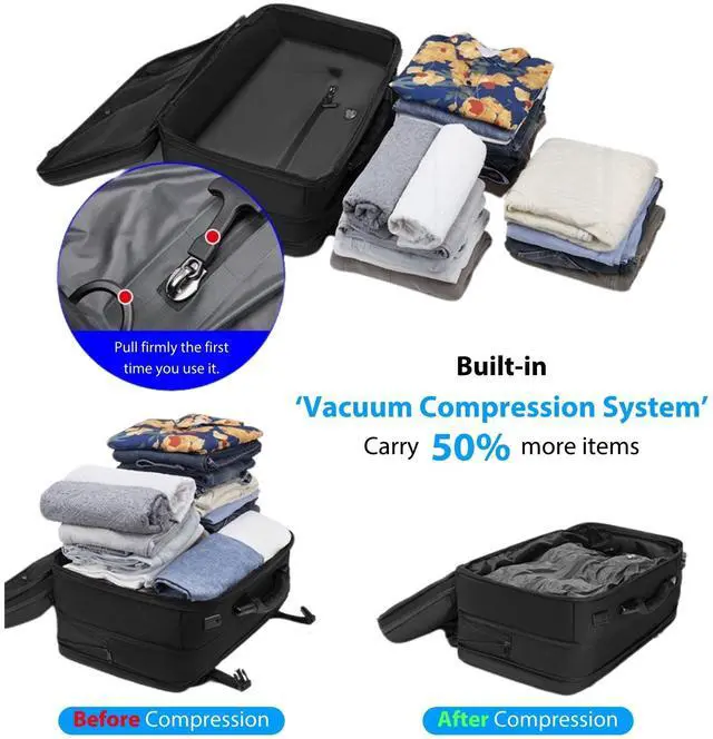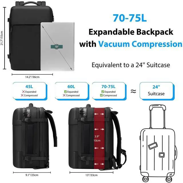 Durable, eco-friendly materials ensure long-lasting performance ^^ 9 Compartments for Smart Storage & Security This vacuum backpack travel with pump includes 2 main compartments a padded laptop compartment (fits up to 19'') and a vacuum compression compartment plus 7 functional pockets: 2 front pockets, a shoe compartment, water bottle pocket, hidden anti-theft pocket, and 2 internal pockets. TSA-approved lock ensures added security ^^ Dry and Wet Separation, Odor-Free Shoe CompartmentMegaback compression backpack organizes your gear efficiently with dedicated dry and wet separation pockets, perfect for storing damp clothes or electronics. The odor-free shoe compartment keeps footwear separate and fresh, ensuring your clothes remain clean and fresh on the go ^^ Comfortable, Ergonomic Design & Multipurpose UseDesigned for ultimate comfort, the Megaback air backpack with pump features ergonomic, adjustable straps, breathable padding, and a sturdy frame. Whether for travel, business, or outdoor adventures, its multipurpose design makes it your perfect companion, reducing strain and enhancing mobility