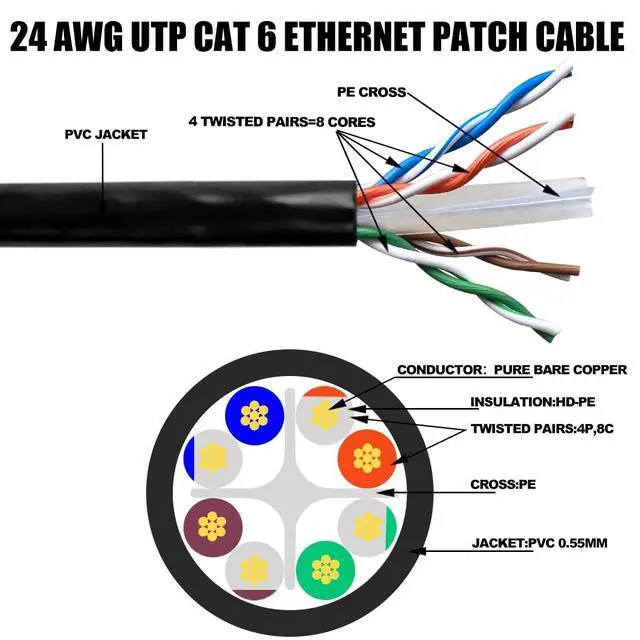 Each of the 4 unshielded twisted pairs (UTP) are separated by a PE cross insulation to isolates pairs and prevent crosstalk and covered by a 5.5 mm PVC jacket. ^^ Superior Connections-RJ45 connectors of this ethernet patch cord feature 50 micron gold-plated contacts for high-speed data transfer and corrosion resistance and strain-relief boots for enhanced durability and easy to plug and unplug from ports ^^