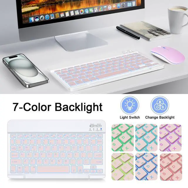 Backlit Bluetooth Keyboard: This backlit bluetooth keyboard has 7 switchable backlight colors, It helps you to type easily in the absence of light. The bluetooth keyboard adopt a scissors switch design, which allows you to have a comfortable and quiet typing experience and enhance your work or entertainment experience and fun.