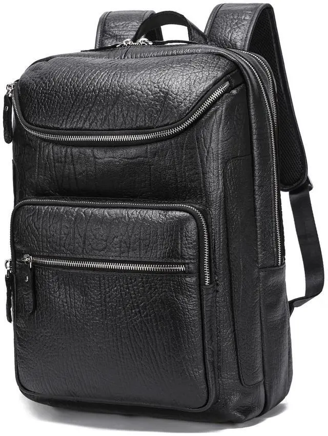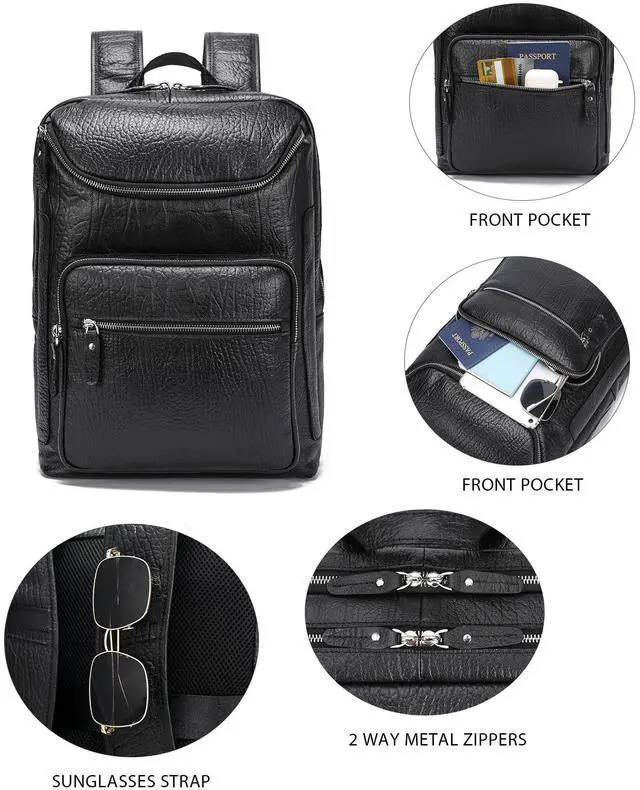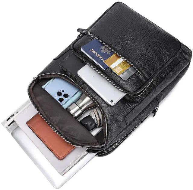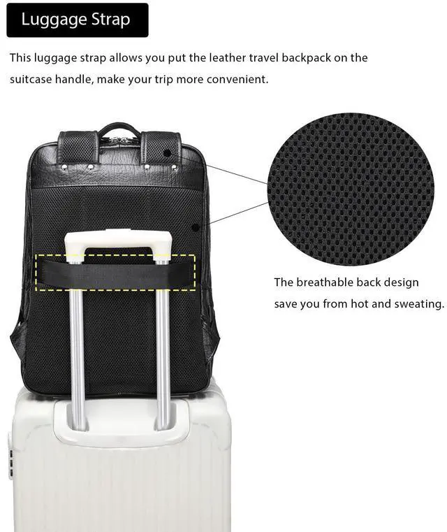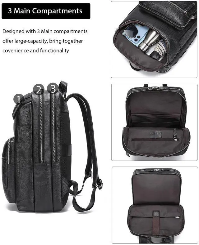 Dimensions: 16.1" (H) x 5.5" (W) x 11.8" (L), Weight: 3.4 lb ^^ Large Capacity 3x main compartments, 2x front zipper pockets, interior zipper pockets, 3x card slots, 1x laptop sleeve for 16" laptop, 1x tablet sleeve for 12.9" iPad, adjustable shoulder straps, zipper closure. The Leather backpack offers large-capacity, but brings together covenience and functionality ^^ Travel-FriendlyThis backpack is an excellent travel companion, 3 Main compartments for you to keep your stuff well organized, suitable for traveling, business trip, hiking, weekender or camping ^^ Versatile and Hands-FreeFeatures a back belt that slips over luggage handles. Stack this large capacity backpack on your wheeled luggage to free your shoulder or hands while carrying heavier stuff ^^ 1 year service for any quality issue