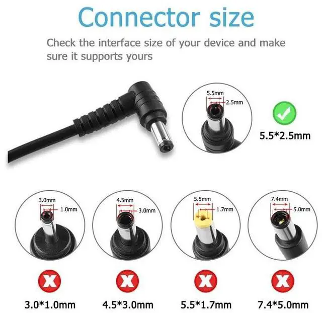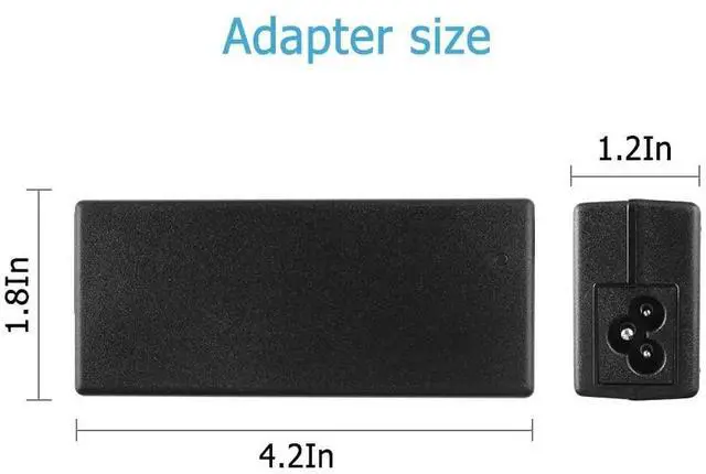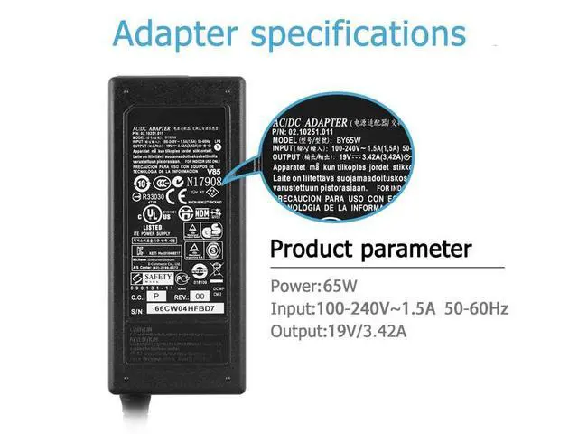 • [Product Specifications]Input: 100-240V 50/60Hz , Output: 19V 3.42A , Max Output Power: 65W .Connector Size: 5.52.5mm(ref to the picture), Color: Black.