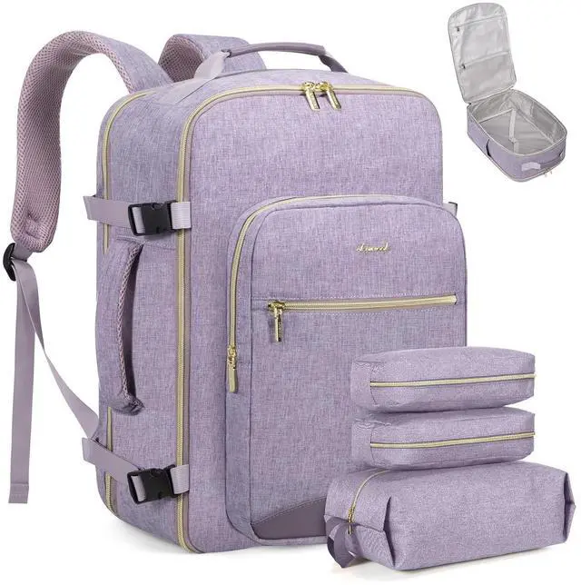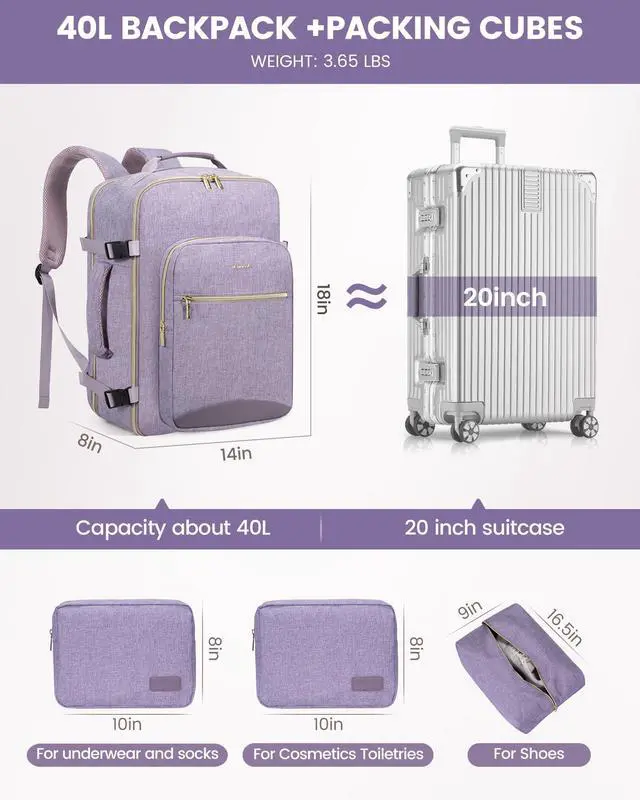 Large Capacity & Multiple Pockets: The travel backpack has a 40L large capacity and 4 main compartments, which can meet daily and travel needs. The travel backpack for women's main compartment can store a lot of things, including 5-8 pieces of clothing, shoes, books, and many other items. The separate laptop compartment is padded with EVA foam to provide the best protection for your 17" laptop and 12.9" iPad. The front compartment has many pockets to keep your belongings organized. ^^