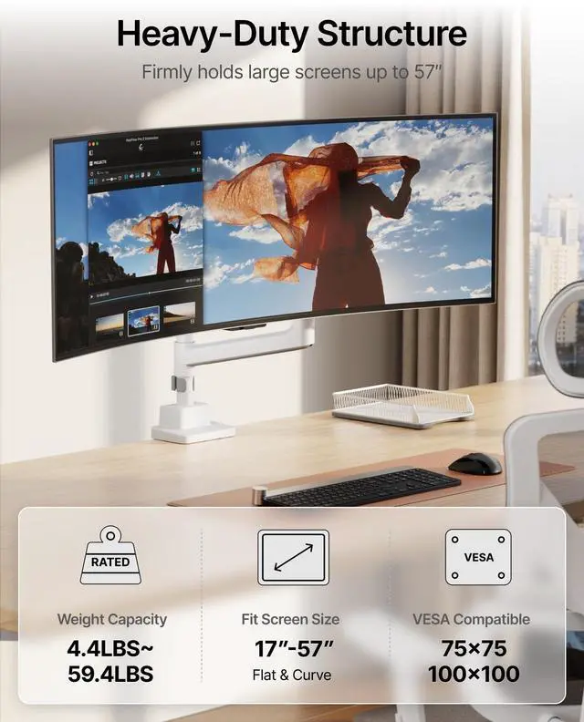 Wide Compatibility & Rock-Solid Stability: Supports 17" to 57" curved monitors with VESA patterns from 75x75mm to 100x100mm. Built with heavy-duty aluminum, it ensures exceptional stability and has passed over 20, 000 cycles of stress testing. ^^ Ergonomic Flexibility for