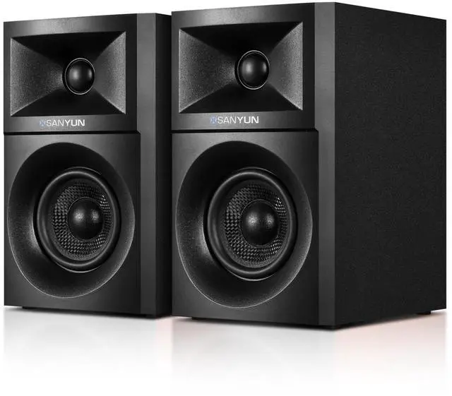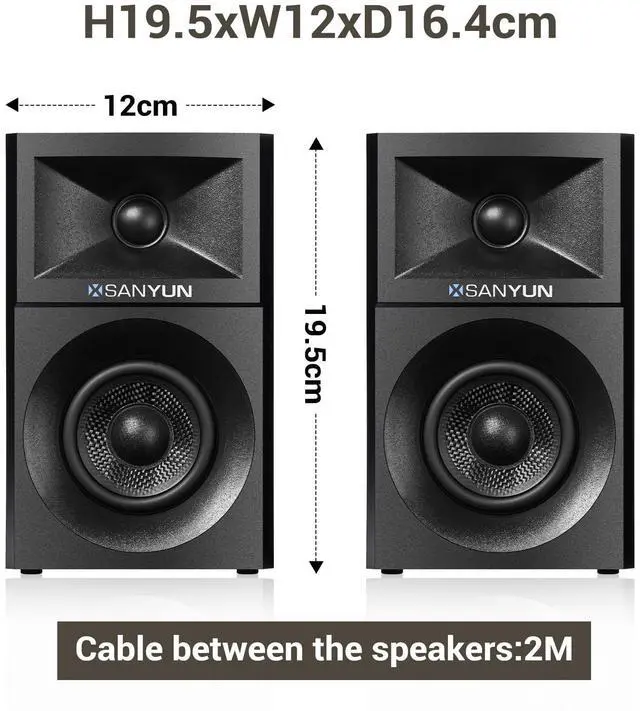 Triple Hi-Fi Connections: Bluetooth 5.4, USB DAC, AUXStream wirelessly with stable Bluetooth 5.4. For the best possible sound, use the USB input featuring a built-in 24bit DAC that processes digital audio directly, minimizing quality loss. The 3.5 mm AUX input offers universal wired compatibility. Enjoy your music your way. ^^ Elegant Wood Cabinet, Compact Desktop DesignCrafted with high-quality MDF wood cabinets to effectively suppress resonance and provide a solid acoustic foundation. Features premium PVC finishes in your choice of Black Matte for sophisticated style. Compact dimensions (H 19.5 xW12xD 16.4 cm) fit perfectly on any desk. Includes a 2-meter speaker cable for flexible placement. ^^ Customize Your Sound with Precision ControlsEasily tailor the audio to your preference with dedicated professional-grade knobs on the main speaker's rear panel: Master Volume, Treble, and Bass adjustment. Dial in the perfect sound, whether you crave deep, powerful lows, crisp, detailed highs, or a balanced natural profile.
