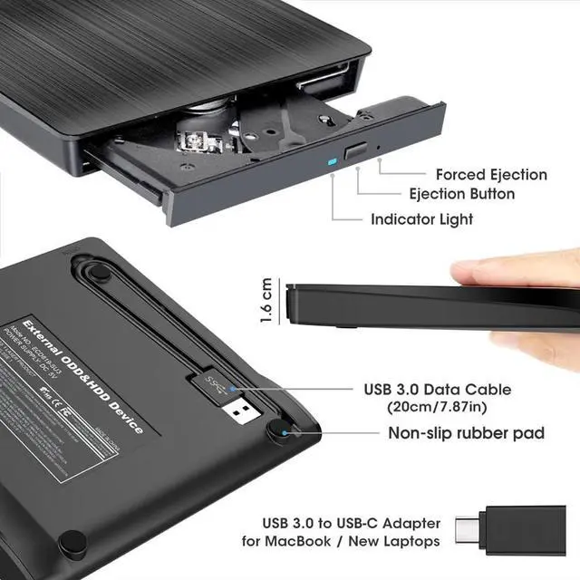 You can then use your preferred software to read, burn, or rip discs easily, just like using an internal drive. (Scroll down for detailed setup guide and recommended software. ) ^^ Powered by USB 3.0 High SpeedEnhanced USB 3.0 not only delivers ultra-fast data transfers up to 5 Gbps (625MB/s) 10 faster than USB 2.0 with DVD 8X and CD 24X maximum read/write speeds, but also ensures smooth, stable, and reliable operation with strong error correction, minimal noise, and long-lasting durability. For modern ultra-slim laptops with only USB-C ports, a USB 3.0 to USB-C adapter is included, allowing seamless and hassle-free connection with most computers, old and new ^^ Wide CompatibilityWorks with Windows 11/10/ 8.1 /7/Vista/XP, Linux, and macOS 10.16 or later.