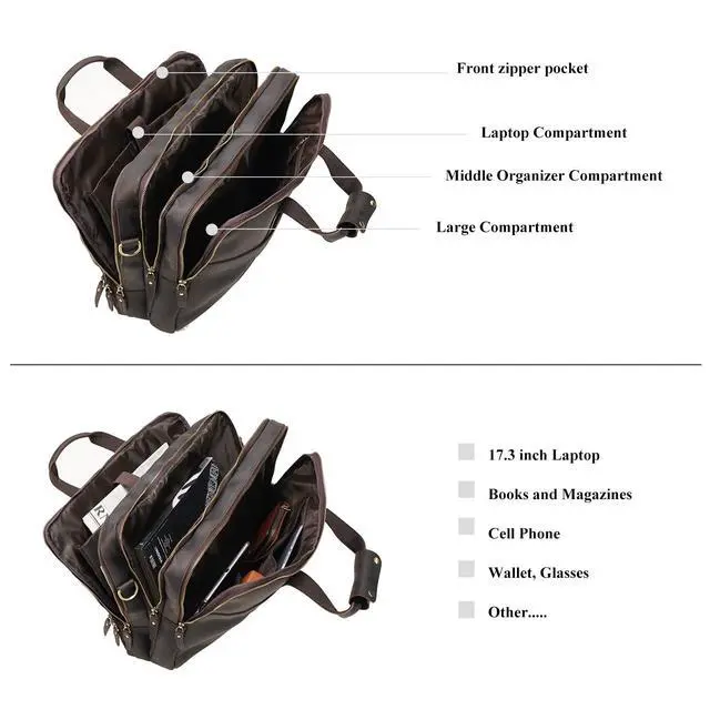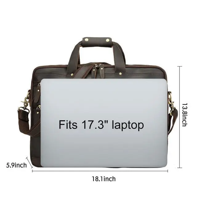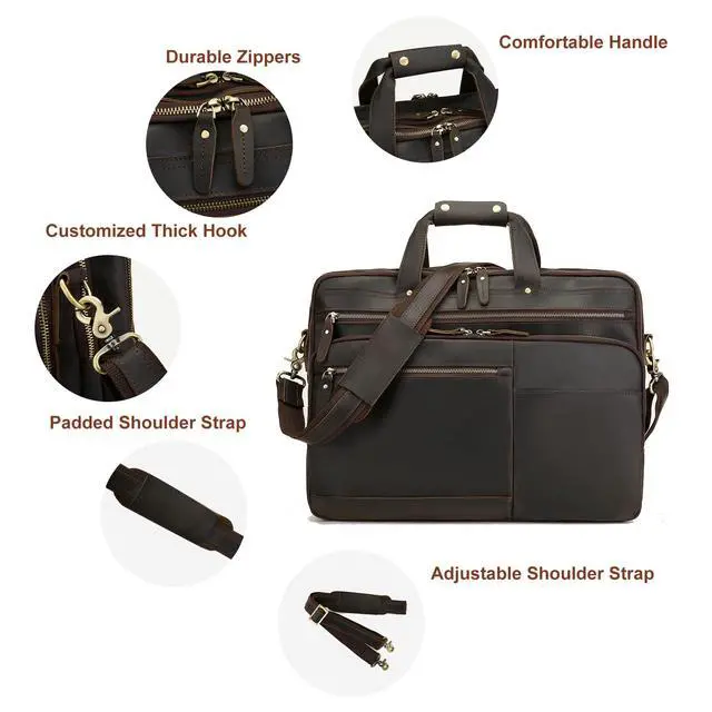 High QualityThe laptop briefcase is made of 100% full grain leather which have disorder "scratches" that present the style of retro and wildness, thick and durable. This leather satchel will be luxurious in genuine leather with a durable top handle and sturdy gold hardware. This leather laptop bag with solid and sturdy hardware for zippers, buckles, closures to ensure long lasting durability. The leather briefcase will be getting even better over time. ^^ Convenient DesignedLuggage strap on the back designed allows you attached it to a luggage securely. The leather laptop bag can be carried as top handle handbag, 17.3 laptop briefcase, business work office bag, travel crossbody messenger bag, daily shoulder bag, crossbody bag, computer bag, teacher or lawyer attache case, college students satchel.
