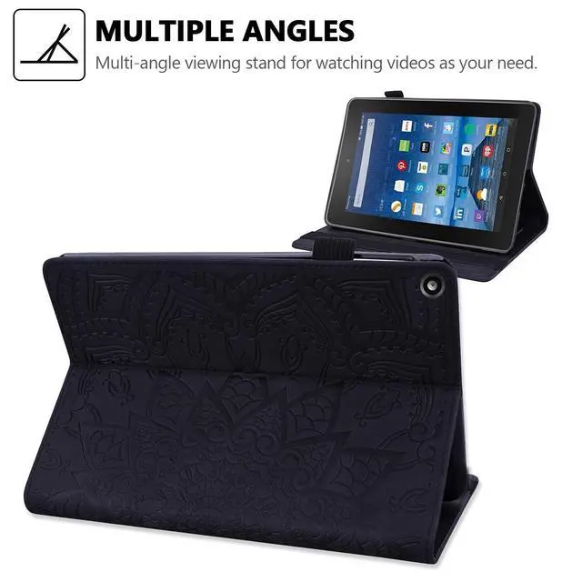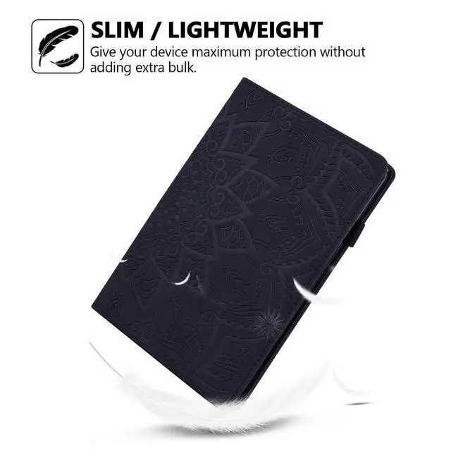Features: Pretty mandala flower embossed surface, offers exquisite and attractive look for your tablet. Easy access to all features and controls (camera, charging port, volume button, etc) without removing the case. Elastic strap closure ensures cover securely closed, double fixing your device when fold the front cover backward for reading. Front-to-back protective cover case give a full protection for your tablet against dust, water, fingerprints, scratches, shocks and bumps. It can be used as a stand with adjustable horizontal position that allows you to view it easily when it is placed on a desk. Interior with 2 card holders for carrying your ID/ credit cards/ business cards/ photos. Side with an elastic loop holder for stylus.
