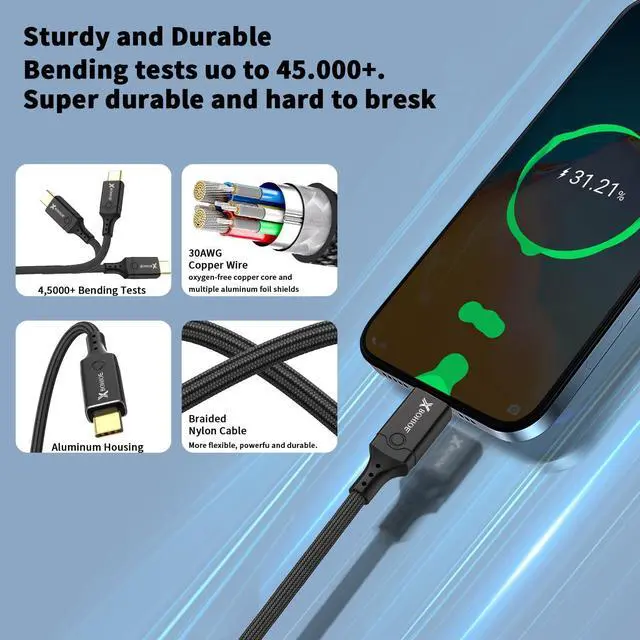 (Note: Requires DisplayPort Alternate Mode support on devices) ^^ Smarter 240W PD ChargingUp to USB C 240W (48/5A) power supply when paired with a compatible charger. Whether it's a power - hungry laptop or a tablet, it can charge them quickly and safely. Compatible Work with MacBook/iPad, iPhone 15/16, GoogLBook, Galaxy S21 series and more ^^ Tough Durable DesignWrapped in premium nylon and reinforced with aluminum casing, it resists frays, drops, and travel wear. This design not only gives the cable a longer lifespan but also prevents tangling. Your ideal USB-C 1.5 ft cable for life on the gorugged, reliable, road-ready