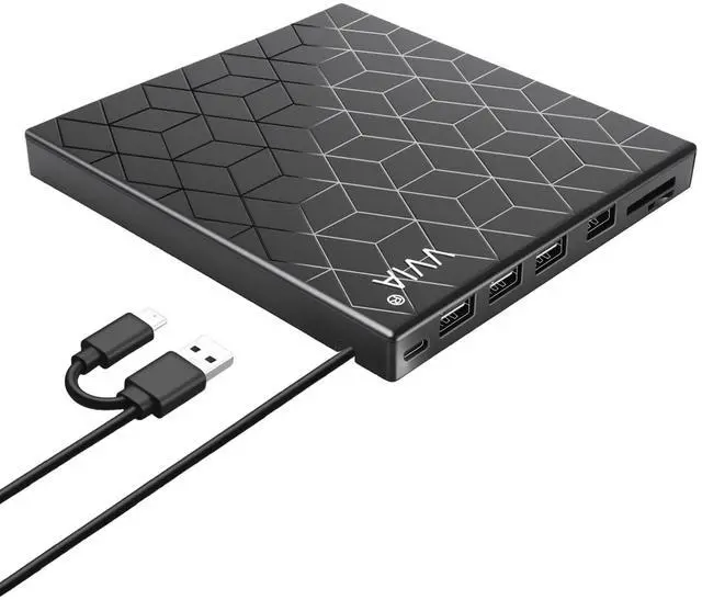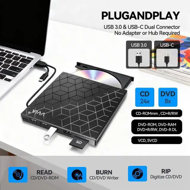 Ultra-Slim Design: Compact and lightweight external DVD drive with a sleek geometric pattern for modern aesthetics.