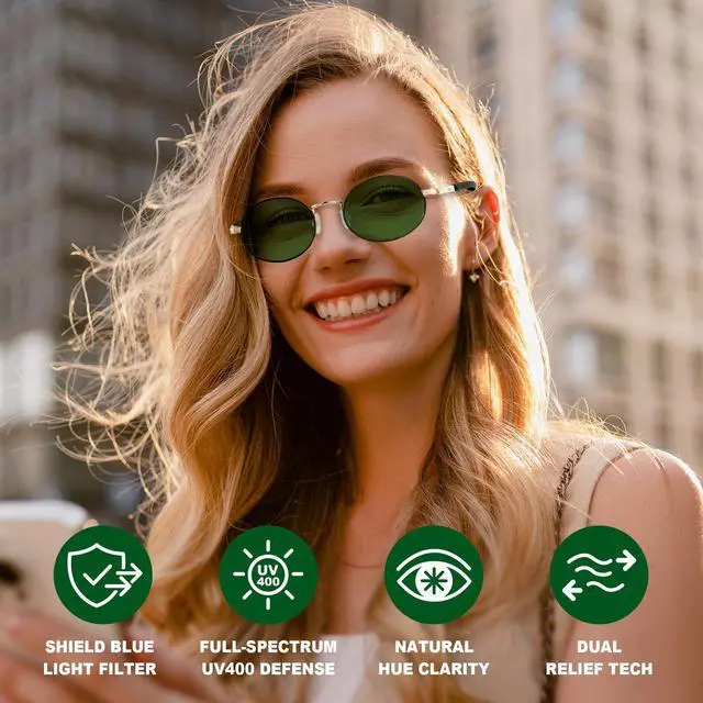 Included: 1x magnetic hard case, 1x soft pouch, 1x cleaning cloth, 1x mini screwdriver, 1x user manual. Lens Benefits The green-tinted PC lenses are designed to soften harsh lighting and reduce glare from screens or fluorescent lights. While not a medical solution, they may help alleviate eye fatigue caused by prolonged exposure to bright environments. Care Instructions Clean lenses with the provided microfiber cloth; avoid paper towels or abrasive materials. Store in the hard case when not in use to prevent bending or lens damage. Keep away from high temperatures or chemicals. Usage Scenarios Suitable for daily indoor/outdoor wear, computer use, reading, or driving in daylight. The neutral green hue preserves color accuracy, making them versatile for work and leisure.