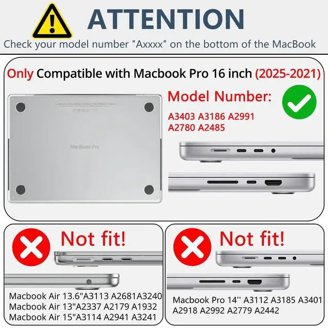 COMPATIBLE MODELSOnly Compatible with MacBook Pro 16 inch 2025 2024 2023 2023 2021 Release M4 M3 M2 M1 Pro/Max Chip with Liquid Retina XDR Display&Touch ID (Models: A3186 & A3403 & A2991 & A2780 & A2485). Not fit for Model A2141 Release 2019 or other size ^^ CRYSTAL TRANSPARENTDesign for MacBook Pro 16 inch case is made of high-quality hard PC materials with good abrasion resistance for protecting your laptop from everyday scrapes, dirt, smudges and other damages, and transparency is different from color to color ^^ ULTRA-THIN DESIGNAdopt slim cover and back to keep the original shape. Real MacBook Pro 16 inch to open mold design and with four anti-slip silicone feet but no logo cut out. Lightweight give you no bulky, elegant appearance makes your laptop stand out from the crowd ^^ ACCESS TO ALL PORTSPrecise cutouts allow to access all functions and controls easily. Plug your charger, cable or headset without removing the case. Aside from regular port cut-outs, the bottom of the cover is designed with two rows of vent slots for proper ventilation ^^ 3 IN 1 COMBINATIONOne set fits for all needs.