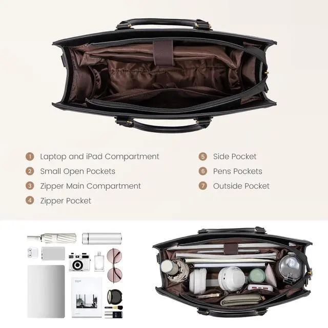 Comprehensive Protection & OrganizationElevate your style while safeguarding your essentials with our womens tote bag. It features a dedicated laptop compartment for optimal protection. It includes 2 inner pockets, 2 slip pockets, and 1 zippered pocket, perfect for organizing your water bottle, umbrella, phone, wallet, makeup, passport, and more