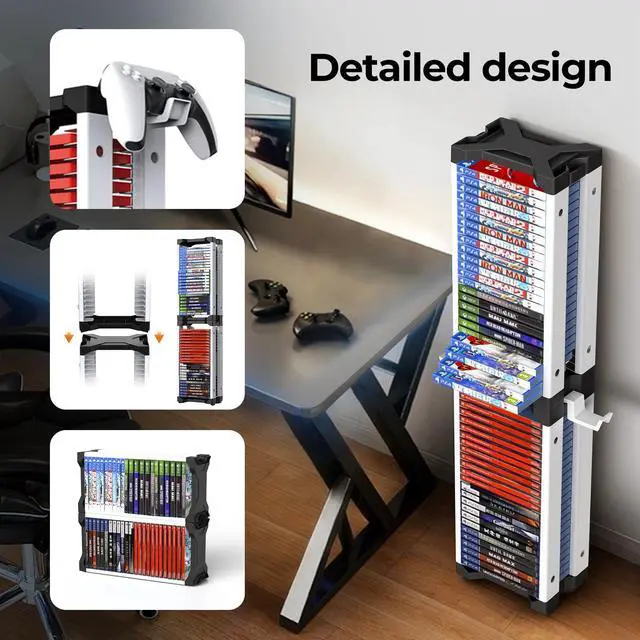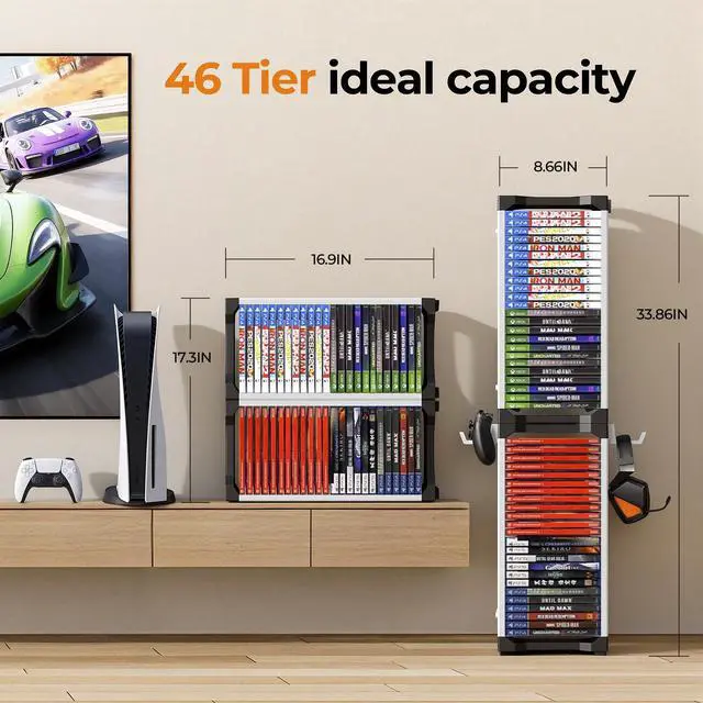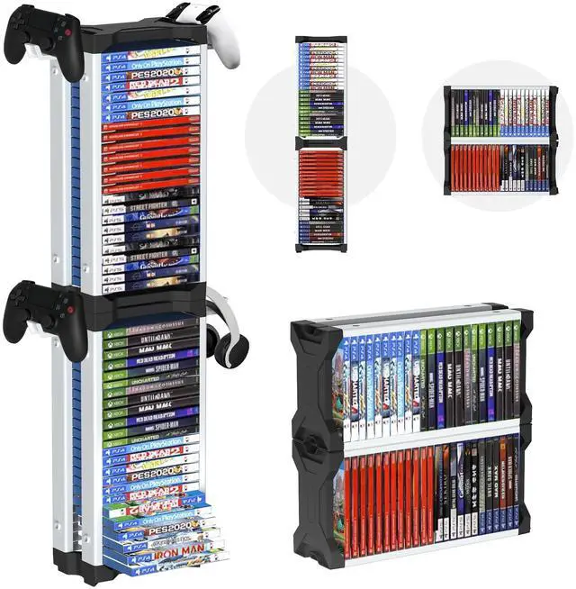 Large Capacity & Upgraded Material The single-layer storage shelf measures 16.9 x 8.66 x 5.51 inches (capacity for 23 game cases). When two layers are stacked, the overall dimensions are 33.86 x 8.66 x 5.51 inches (capacity for 46 game cases). Constructed from high-quality ABS material, this game case organizer is built to last. ^^ Wide Compatibility for Various Game Cases Compatible with Xbox 360, Xbox One, Xbox Series, PS 2, PS 3, PS 4, PS 5, PSP, Nintendo Wii, Nintendo Switch, and Switch 2 game cases.