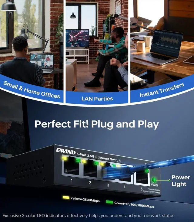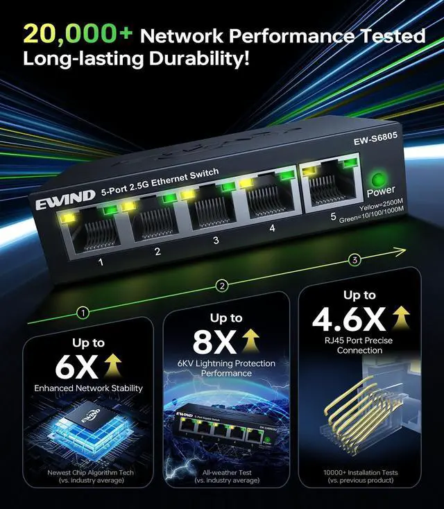 Cat3/Cat4/Cat5/Cat6 cables and 2.5G devices: NAS, WiFi 6 routers, PCIe adapters, servers, gaming PCs, 4K systems, etc. Also, the 5 port ethernet switch have exclusive dual-color LED design lets you quickly distinguish 100Mbps/ 2.5G bps port statuseseven beginners can manage like pros. ^^ Trustworthy 2.5G bps High-Speed SwitchFeaturing a military-grade chipset and double-shielded anti-interference circuitry, this network switch has undergone 50+ rigorous engineering testsincluding 8, 000+ hours of full-load stress testing and 4, 000+ RJ45 port plug/unplug cycles, etc. Its stability, durability, and safety perform NO. 1 among all switch, maintaining like-new performance for 7+ years. Instantly upgrade to 2.5G bps without Cat6 wiringcuts installation costs & hassle by 60%! ^^ Reliable Data Transmission & Industry-Leading Energy EfficiencyThis 2.5 gigabit network switch features dual-channel bandwidth allocation and IEEE 802.3 x flow control, which isolates gaming/4K streaming/downloads while ensuring zero packet loss during high-volume transfers. Our EWSmart technology dynamically adjusts power usage by up to 70% under partial loadsaving users over $200 annually on energy costs versus standard switches. ^^ Silent Operation & Flexible InstallationThis 5-port 2.5G ethernet switch features an exclusive graphene nano-coating fanless design that ensures silent operation.