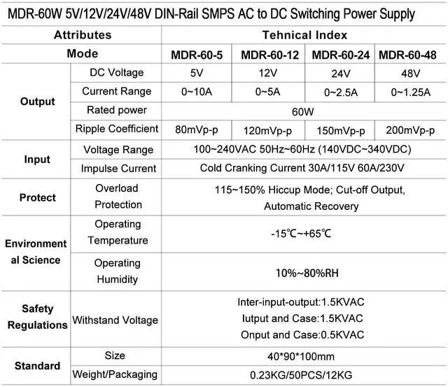 MDR-60-12 DIN-Rail Power Supply, 12V DC, 60W, 5 Amp Highly Efficient and Reliable (MDR-60-12)