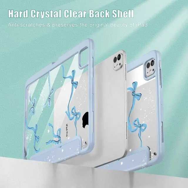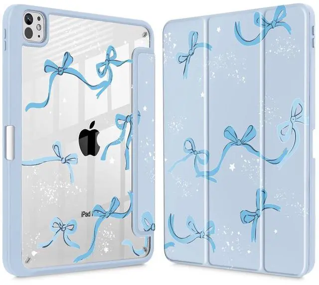Tuiklol for iPad Pro 11 Inch (M5 2025 / M4 2024) Case, Buit-in Pencil Holder with Slim Clear Back Cover Protection Trifold Stand-Auto Wake/Sleep Tablet Case, Black Flower Bow-Blue