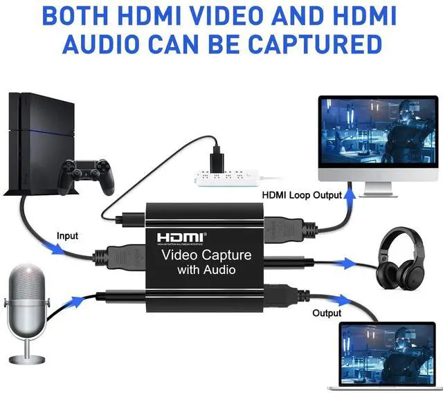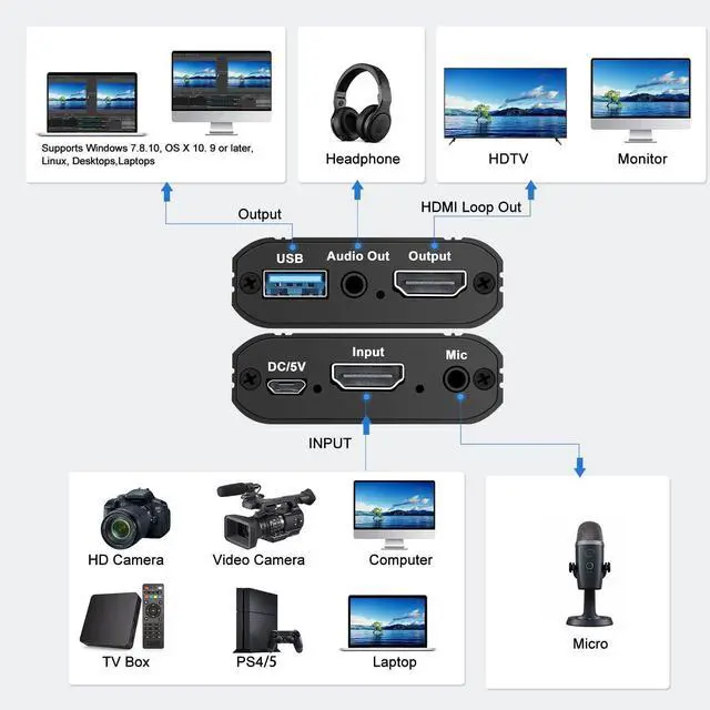 Easily connect a mic or headphones for real-time audio monitoring without extra adapters. ^^ Plug & PlayWorks instantly with Windows 7/10/11, Mac OS X 10.9 +, Linux, and Android. No software setup requiredjust plug in via USB 2.0 and start streaming! Compatible with Switch, PS5, Xbox One, DSLR cameras, and more ^^ Whats Included1x HDMI Capture Card (Aluminum Alloy) 1x USB 2.0 Cable (Dual Male) 1x Micro USB Cable (For Additional Power) 1x User Manual (Easy Setup Guide)