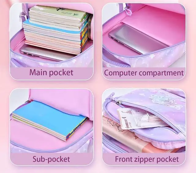^^ Ergonomic Design: This girls' school bag features an ergonomic design with a super soft, breathable back panel filled with sponge. It reduces back pressure while ensuring breathability, promoting healthy growth for children. The reflective strip on the backpack enhances safety by alerting passing vehicles.