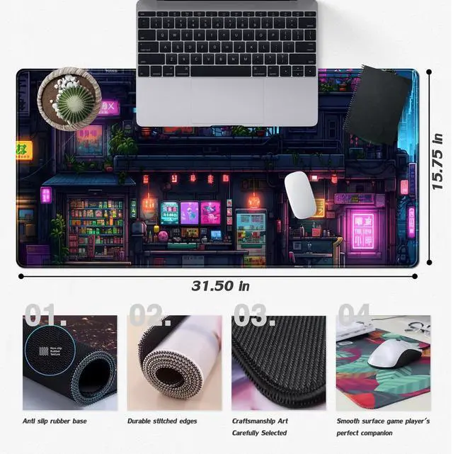 FGHRHT Cyberpunk Desk Mat 31.5''X15.7'' Neon Lights Desk Pad Large Gaming Mouse Pad Modern City Ramen Shop Extended Mousepad XXL Japanese Keyboard Mouse Mat for Computer Laptop Gamers