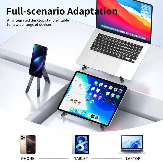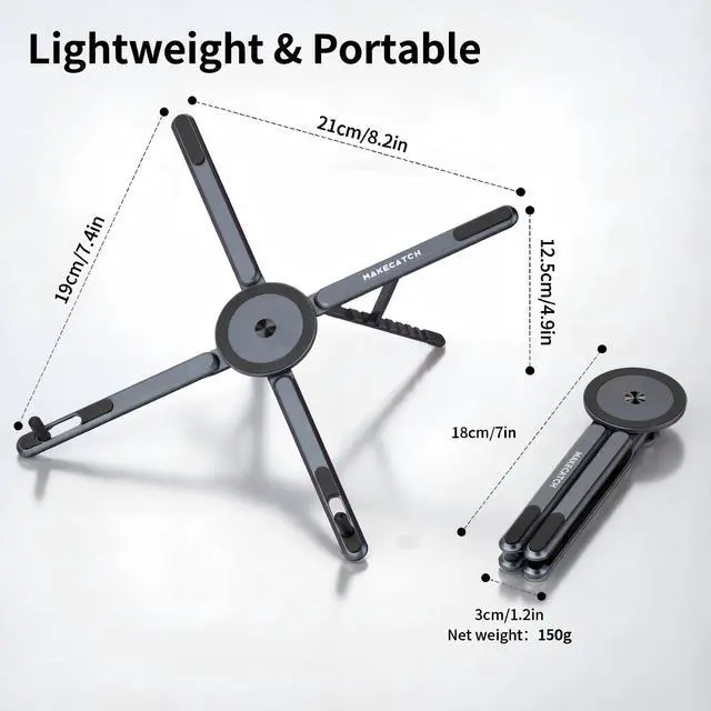 3-Way Multi-Purpose Stand for Laptop, Phone & TabletWorks as a foldable laptop stand (1016"), a desktop magnetic phone/tablet holder (413"), or a travel hanging stand for airplanes, buses, and trains. Switch between work, study, and travel modes anywhere with one compact device ^^ Ultra-Portable, Travel-Ready DesignFolds down to just 2.28 7.12 0.73 inches and weighs only 0.33 lbs, making it perfect for backpacks, purses, work bags, and carry-ons. Includes a velvet pouch for scratch-free storageideal for commuting, remote work, and vacations ^^ 8-Level Height + Stepless Angle AdjustmentChoose from 8 laptop height levels ( 1.895.