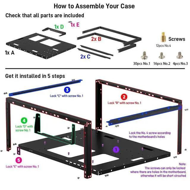 Package Includes: 1 PC Test Bench, 1 power button, motherboard spacer wrench, and screws.
