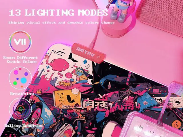 13 Lighting Modes Gaming Mouse Pad Super Glow Fiber provides a great RGB back lit effect. You can choose from 13 lighting modes: 9 static light modes and 4 dynamic mode. ^^ Large Size Gaming Mouse Pad at 31.5 x12 x 0.2 inch The gaming mouse pad will fit your mouse perfectly and provide enough mouse movement space, suitable for all types of mice. ^^ Easy to use, Plug & Play Gaming Mouse Pad This extended mouse pad is powered by USB, plug and play, no driver required. The control button of this mouse pad has been tested for 10 million times and is extremely durable. Just press it to choose the lighting mode you want. Press and hold about 3 seconds turn ON/OFF. And it has power off memory function remembers your last mode selection. ^^ Non-slip & Waterproof Gaming Mouse Pad The durable, non-slip rubber base is designed to eliminate unwanted movement and provide a solid platform for eSports gaming. Waterproof coating surface effectively prevent accidental damage from spilled liquid. ^^ ULTRA SOFT & SMOOTH SURFACEDesign with superfine fiber braided material, and allows more accurate mouse movement. Very comfortable when the wrist touches the surface, Best idea for game or work.