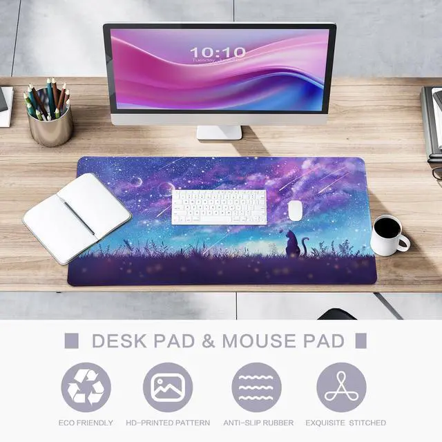Description: Lokigo Cat Desk Mat, Large Mouse Pad, Purple Desk Mat, XXL Gaming Mouse Pad, Big Extended Full Size Mouse Pad, Desktop Desk Matt for Keyboard, Laptop & Computer, 31.5 x 15.7 inchLarge Mouse PadThe full desk mouse pad measures 31.5 x 15.7 inch, with 3mm thickness. Which is big enough to fit your full-sized keyboard, mouse, laptop, or other item on the desk, providing more space for professional gaming or office work.