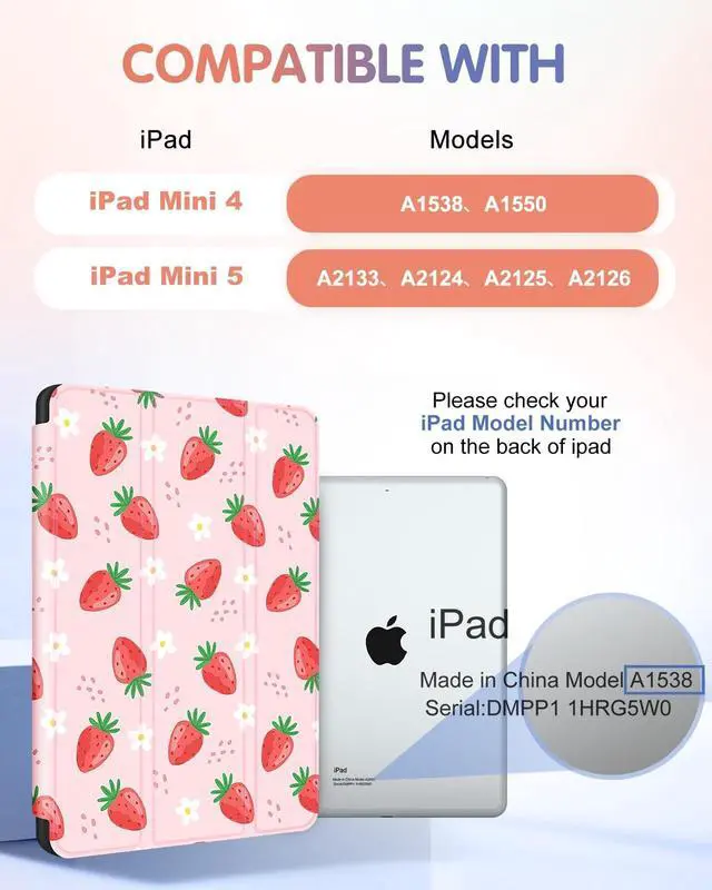Compatible withThis case only compatible with iPad mini 5th/4th gen 7.9 inch 2015/2019. ModelsA1538, A1550, A2124, A2126, A2125, A2133. Not applicable to other models. Please check your model before ordering. ^^ Various StylesThis for iPad mini case 4th/5th generation comes in a variety of styles to suit the needs and personalisation options of different users. Whether you prefer minimalist, trendy or classic, we have the right style for you. ^^ Adjustable AnglesThis for iPad 5/4 mini case supports your ipad in two ways for a more comfortable viewing and operating experience.