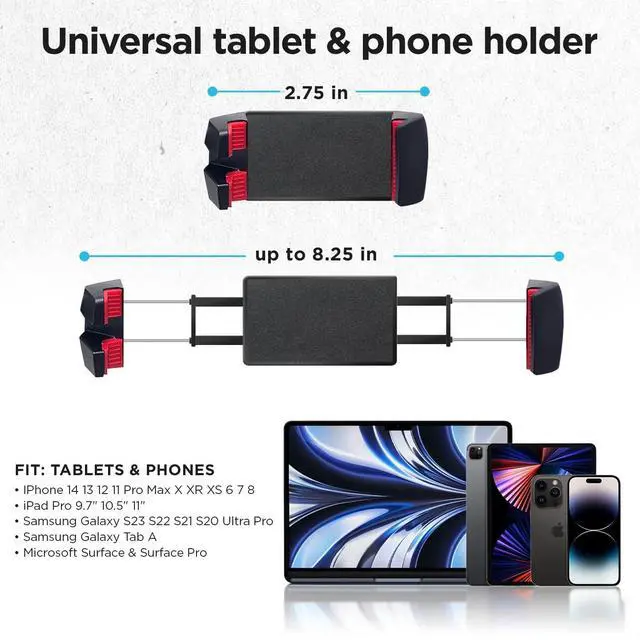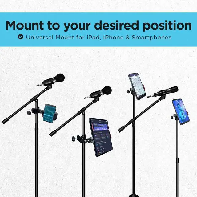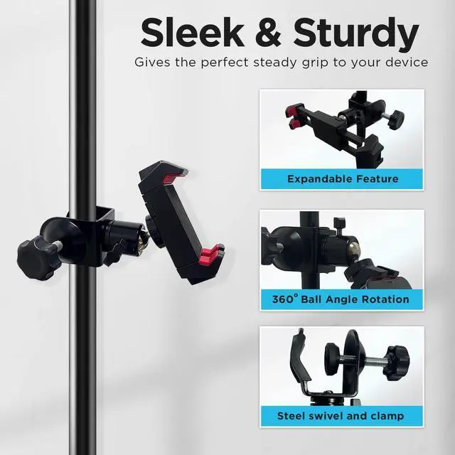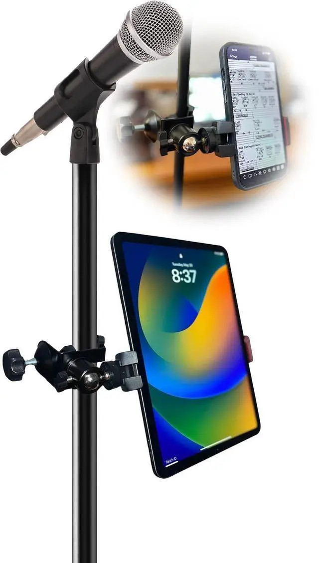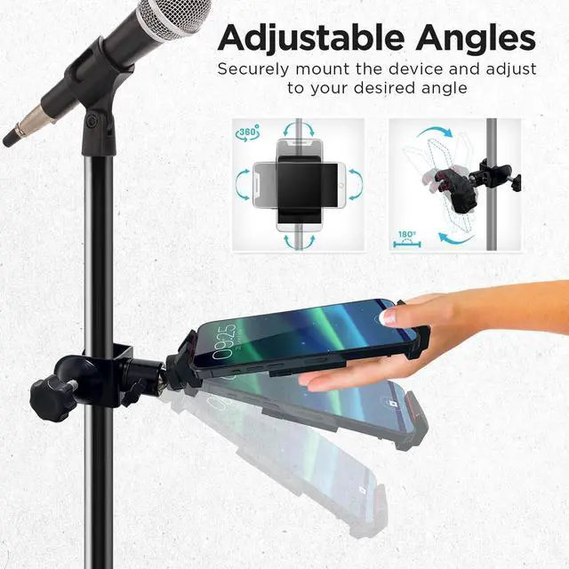 CLIPS SECURELY to microphone stands, desks, shelf edges, or other objects one inch thick or smaller ^^ STEEL AND ULTRA DURABLE swivel and clamp for years of performances ^^ RUBBERIZED GRIPS in device holder and attachment clamps to avoid surface damage to mic pole or shelf ^^ EXPANDABLE to hold variety of devices from small phones to tablets ranging from 2.75 to 8.25 inches ^^ UNIVERSAL FIT with two universal 1/4 inch brass screw receptors for selfie sticks, tripods, etc