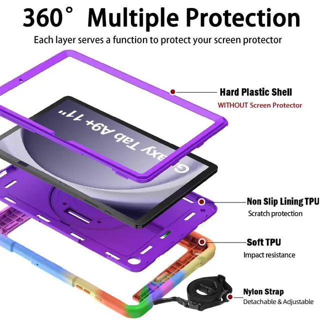 Model number: SM-X210/SM-X216/SM-X218. NO Screen Protector!!! ^^ Full-Body Multiple ProtectionThis Samsung Galaxy Tab A9 Plus Case is made of 3 Layers Protection combined with PC front cover hard PC inner shell soft silicone outer shell. It is long lasting and easy installation. Providing secure protection defense like a glove for Samsung Galaxy Tab A9 Plus tablet ^^ 360 Rotating Hand Strap & StandWith adjustable swivel hand strap and stand, you can hold the galaxy tab a9 plus case 11 by one hand and find the most comfortable viewing angle you need. The built-in stand provides a stable supports, with viewing/drawing/typing angles you need, and it can be folded up when not in use ^^ Multifunctional Carrying StrapSamsung A9 Plus tablet Case come with detachable and adjustable shoulder strap (32'' to 61''), get a quick carry around and release your hand from Samsung tablet a9 plus any time, not worry dropping any more. Hang it anywhere for your better entertainment, make your hands free ^^ SERVICEBMOUO will offer 180 days maintenance or replacement service for Samsung Galaxy Tab A9 Plus case. If you have questions, please feel free to contact us by email, we will follow up with you within 24 hours and you will got a satisfactory and friendly answer