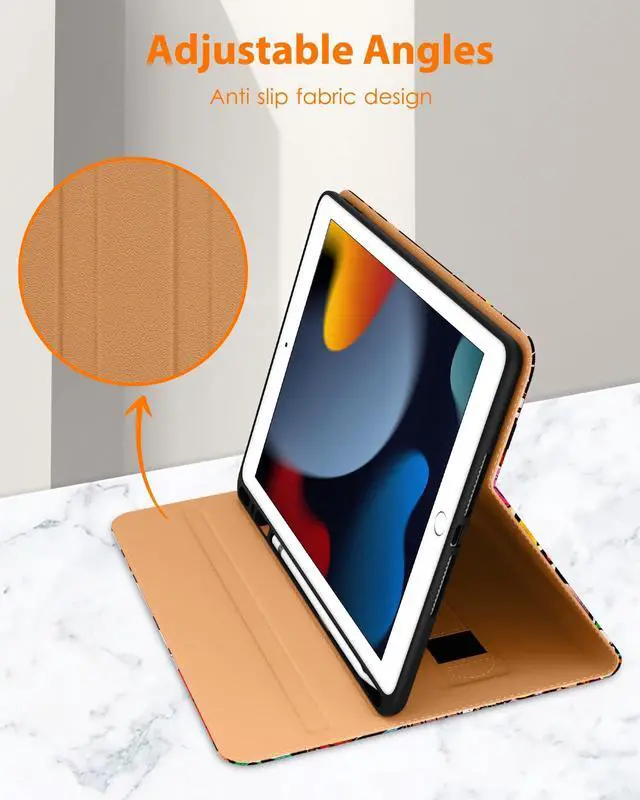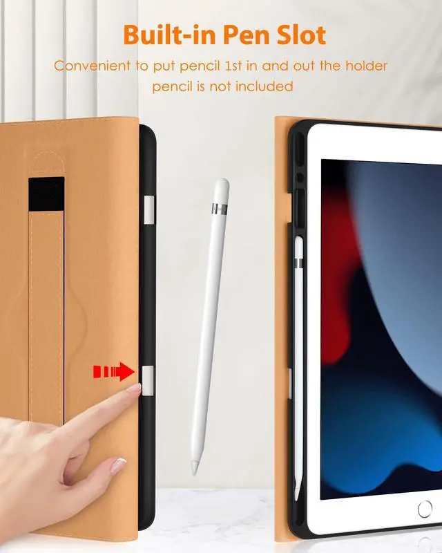 Compatibility: This Folio Case is compatible with 10.2" Tablet iPad 9th Generation 2021(A2602/A2603/A2604/A2605), iPad 8th Generation 2020 (A2270/A2428/A2429/A2430), iPad 7th Generation 2019 (A2197/A2198/A2200). Not compatible with any other iPad devices. ^^ This case gives you the flexibility to adjust iPad 10.2 to multiple angles according to your needs, making it easy to type or watch and freeing up your hands. The file card holder is designed to hold bank cards, bills, cash, paper, documents, etc. while you are on the go. ^^ The exterior is made of high-quality synthetic leather, which is comfortable to touch. The interior is made of soft microfiber that protects against scratches, shocks, drops, and impacts. Slightly raised edges protect iPad's camera and screen from drops. ^^ Built-in magnetic stripe provides sleep/wake function. Unobstructed access to charging port, speaker, headphone jack and volume keys. Built-in leather hand strap (one-handed operation). ^^ The pen holder slot can hold your pen tightly and won't fall off accidentally.