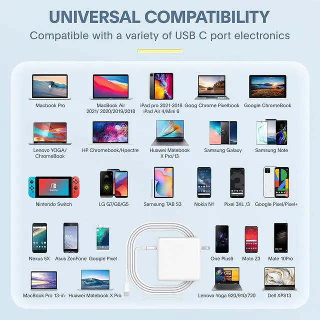 Reliable: Our usb c macbook chargers are manufactured with smart IC chip technology and high quality materials, the charger can automatically and intelligently identify your device and provide the fastest and most efficient output current, avoiding from overloading, overheating, over-current, over voltage and short circuiting. Fast charging speed and long service life ^^ Compact and