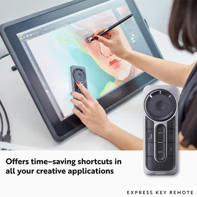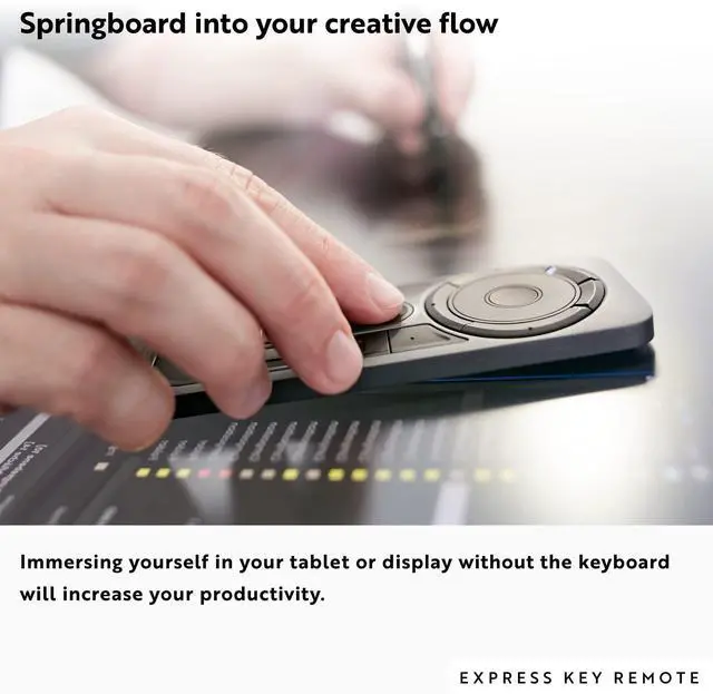 The wireless Express key remote for Cintiq and Intuits Pro is designed for more efficiency and comfort. A set of 17 customizable buttons and touch Ring allow for instant one-touch access to timesaving shortcuts in all your favorite creative applications. Place the Express key remote anywhere It's most convenient while drawing - on screen, in your hand or beside your keyboard. Connect up to five Express key remotes at one time, one for each of your creative software applications, to optimize your workflow. Spend less time searching for what you need and more time getting lost in your ideas.